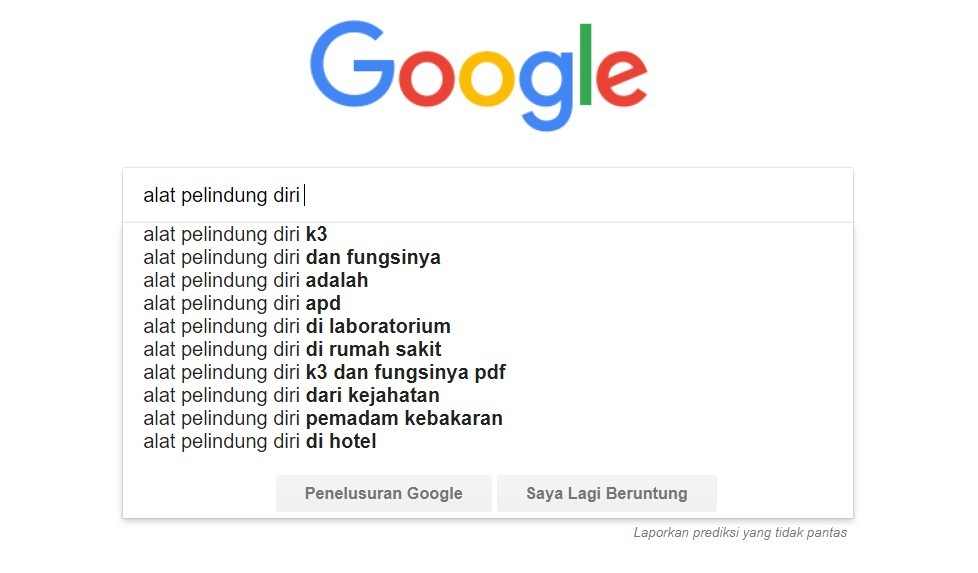 Ide kata kunci baru yang ingin saya gunakan adalah “alat pelindung diri”. Kata kunci ini sifatnya masih sangat umum dan mari kita masukkan ke Google untuk melihat apa saja yang dicari oleh orang-orang tentang kata kunci ini.